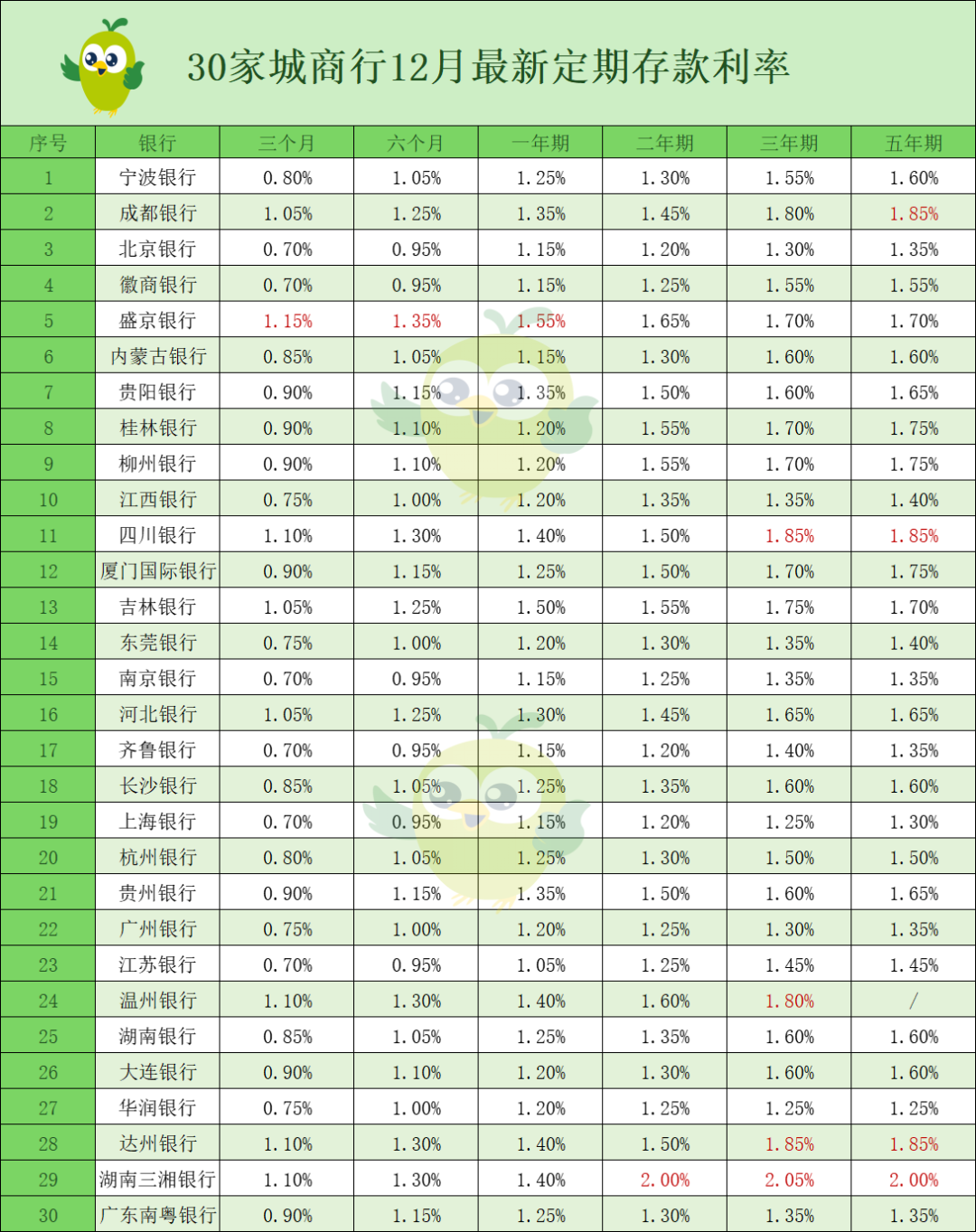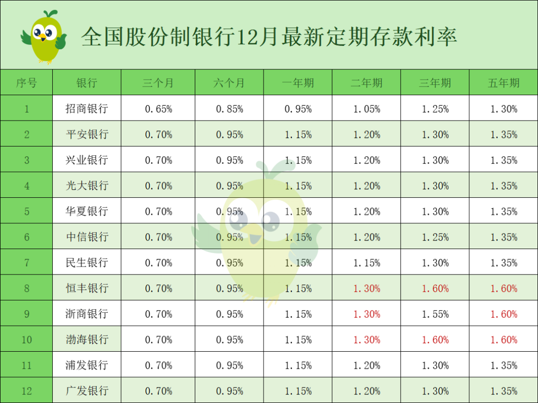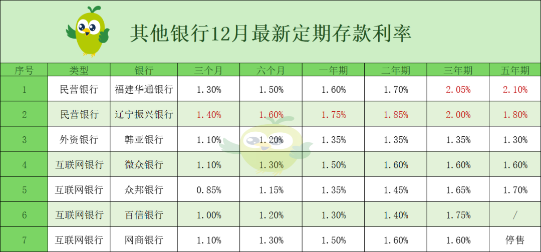 2025 年 12 月银行定期存款彻底变天了! 六大行直接把 5 年期大额存单停售,不少中小银行连 5 年定期也下架了。 ![]() 甚至有些民营银行连 3 年定存也停售了,存长期的选择越来越少! ![]() 目前全国各大银行的定存利率还有多少呢? 本文为大家详细梳理了全国65家银行12月的最新定存利率情况。 再说说低利率时代,钱除了存银行,还能怎么打理? N1全国65家银行定期存款利率大比拼国有六大银行定期存款利率表 ![]() 国有六大行的定存利率这次没调整,整体水平都差不多。 三个月到五年期的利率基本是 0.65%、0.85%、0.95%、1.05%、1.25%、1.30%。 也就邮储银行的六个月(0.86%)和一年期(0.98%),比另外五家高了那么一点点。 想求稳的话,选六大行肯定错不了。 股份制银行定期存款利率表 ![]() 12 家股份制银行的定存利率整体比六大行高一些,其中 9 家利率没动。 浙商银行和渤海银行的利率连续 2 个月下调后,二年期降到 1.3%,三年、五年期分别是 1.55%/1.6%、1.6%/1.6%。 不过恒丰银行、渤海银行的三年和五年期利率都能到 1.60%,在股份制银行里算是拔尖的。 城商行定期存款利率表 30 家城商行的利率差距比较大,盛京银行这次全面下调,三年、五年期都降到 1.7%,河北银行、华润银行也下调了部分期限的存款利率。 但温州银行、成都银行、四川银行、湖南三湘银行这些,三年、五年期还有 1.8%-2.05%。 ![]() 农商行定期存款利率表 利率和六大行差不多,成都农商行是个例外。 三年、五年期利率都有 1.85%,在农商行里算高的了。 ![]() 其他银行定期存款利率表 包括7家民营银行、互联网银行和外资行。 韩亚银行这次降了不少,3、5年期利率都降到股份制银行水平了; 福建华通银行3年期2.05%、5年期2.10%,辽宁振兴银行3年期2.00%,这2家利率比较高; 网商银行这次把5年定存给直接下架,不玩了。 ![]() N2低利率时代,别只盯着银行银行定存利率一降再降,长期产品还不好买,光靠存银行稳健增值,越来越不现实了。 不少聪明人早就把目光转向香港,可不是买美元存款哦,而是比内地定存更划算的2种储蓄型产品。 第一种是固收储蓄险 比如立桥智选储蓄保,收益直接写进合同,保本保息,5 年保证年化单利 4.75%。 举个例子,一次性存 25 万美金,有 6% 保费折扣,实际花 23.5 万美金: 第二年就能保证回本,第五年能拿回 290758 美金,复利IRR为4.35%,年化单利高达4.75%! ![]() 不过这个产品要 10 万美金(约70万人民币)起投,适合资金多的朋友。 第二种是香港储蓄分红险 安全性和国债、银行存款差不多,本金有保障, 长期复利收益预期在6%左右,还能一辈子稳定拿利息,孩子教育、自己养老、财富传承都能靠它解决。 举个例子,45 岁女性每年投12万美元,连投5年。 从第五年开始每年能领 3.6 万美元利息,折合人民币约 25.5 万元,每月就有 21240 元,一直领到老。 ![]() 领到 80 岁的话,累计能领走 111.6 万美元,账户里预期还剩 86.5 万美元,总收益高达198万美元,本金翻了 3 倍多! 如果你也想长期稳健吃息,想知道按你的预算每年领多少? N3写在最后现在银行定存利率那么低,长期产品还难买。 与其把钱放在银行、眼睁睁看着越存越缩水,不如换个方向,选择香港的储蓄分红险。 毕竟它的收益比内地高出太多,还能多币种配置,降低单一货币风险的同时,还可以解决教育、养老、传承等各种问题。 如果你有保险问题,关注微信公众号“哆啦A保”,可免费获取任意一份保险资料,欢迎来撩~ ![]()