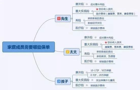 1、意外险 是以意外伤害而致身故或残疾为给付保险金条件的人身保险。保障内容上一般包括,意外身故、意外残疾、意外医疗费用补偿、意外住院津贴、特定意外险等。 2、重大疾病险 当被保险人确诊合同约定的某种疾病时,如恶性肿瘤、心肌梗死、双目失明等重疾,保险公司按合同约定的保额,一次性支付给被保险一笔保险金。 3、寿险 是以人的寿命为保险标的保险,被保险人在保险责任期内生存或者死亡,保险公司依据保险合同规定给付保险金,分定期寿险、终身寿险、两全保险。 4、医疗险 是以被保险人的健康为保险标的保险,是为补偿疾病所带来的医疗费用的一种保险。 二、家庭成员需要哪些保单?