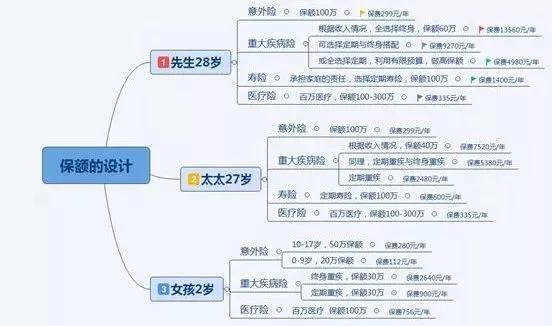 保险在家庭理财规划中,是风险管理工具,而非投资工具。买保险,保障放在第一位。 保障的内容应该第一层级优先考虑疾病、身故、残疾等最基本的生活保障。其次,在考虑子女教育、养老、投资等。 购买保险的基本原则,保费支出不能成为生活压力,保额能够足以弥补家庭经济收入损失。 对于三口之家就行一个商业保险方面的规划是非常具有典型意义的,下面正式开始典型的三口之家保险规划。